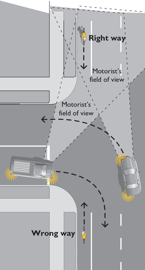 Riding against the direction of traffic creates blind spots in which drivers may not be able to see or react accordingly to riders which may lead to serious injury or death.