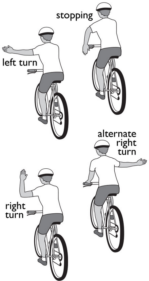 In British Columbia Bicycles are to be ridden on the right side of the road, as close to the white lane lines as possible. Riders are not required to ride to the right of the white line, and can ride single file in the road lane way provided they are as mentioned above. While riding the on the road cyclists need to communicate with motor-vehicle drivers and do so with hand signals. Be sure to read, and understand the following hand signals, their meanings and uses before commencing your ride.